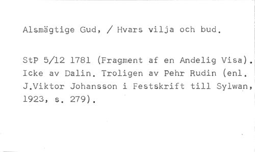 Alsmägtige Gud, / Hvars vilja och bud. //// StP 5/12 1781 (Fragment af en Andelig Visa). Icke av Dalin. Troligen av Pehr Rudin (enl. J.Viktor Johansson i Festskrift till Sylwan, 1923, s. 279).