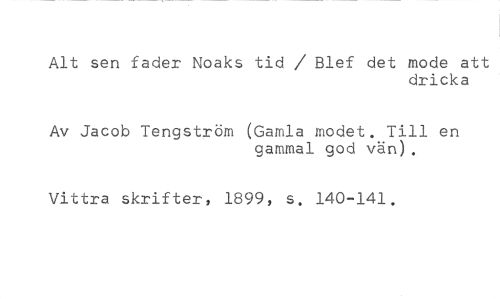 Alt sen fader Noaks tid / Blef det mode att //// dricka //// Av Jacob Tengström (Gamla modet. Till en //// gammal god vän). //// Vittra skrifter, 1899, s. 140-141.