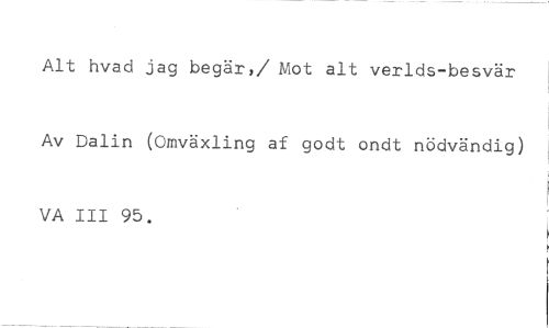 Alt kvad jag begär,/ Mot alt verlds-besvär //// Av Dalin (Omväxling af godt ondt nödvändig) //// VA III 95.
