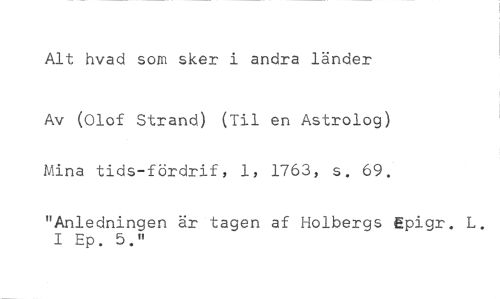 Alt hvad som sker i andra länder //// Av (Olof Strand) (Til en Astrolog) Mina tids-fördrif, 1, 1763, s. 69. //// "Anledningen är tagen af Holbergs Epigr. L. I Ep. 5."