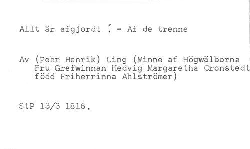Allt är afgjordt - Af de trenne //// Av (Pehr Henrik) Ling (Minne af Högwälborna Fru Grefwinnan Hedvig Margaretha Cronstedt född Friherrinna Ahlströmer) //// StP 13/3 1816.
