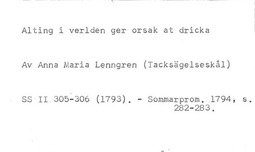 Alting i verlden ger orsak at dricka //// Av Anna Maria Lenngren (Tacksägelseskål) //// SS II 305-306 (1793). - Sommarprom. 1794, s. //// 282-283.