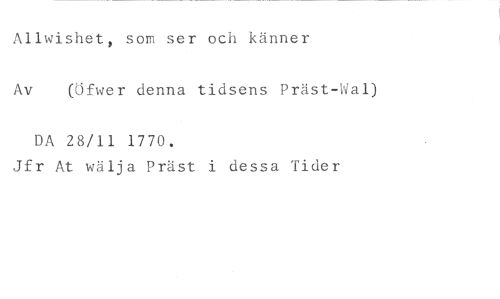 Allwishet, som ser och känner //// Av (Öfwer denna tidsens Präst-Wal) //// DA 28/11 1770. //// Jfr At wälja Präst i dessa Tider