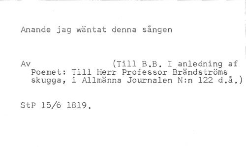 Anande jag wäntat denna sången //// Av (Till B.B. I anledning af //// Poemet: Till Herr Professor Brändströms skugga, i Allmänna Journalen N:n 122 d.å.) //// StP 15/6 1819.