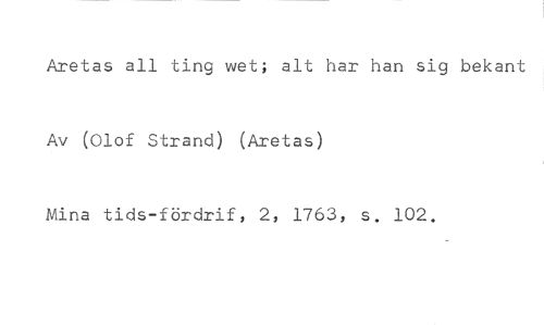 Aretas all ting wet; alt har han sig bekant //// Av (Olof Strand) (Aretas) //// Mina tids-fördrif, 2, 1763, s. 102.