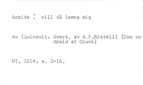 Armida : vill då lemna mig //// Av (Quinault, övers. av A.F.Ristell) (Duo ur Armid af Gluck) //// MT, 1814, s. 2-16.