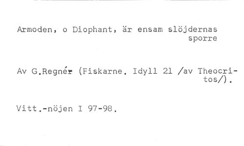 Armoden, o Diophant, är ensam slöjdernas //// sporre //// Av G.Regner (Fiskarne. Idyll 21 /av Theocri- //// tos/). //// Vitt.-nöjen I 97-98.