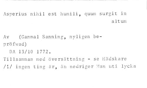 Asperius nihil est humili, quum surgit in //// Av (Gammal Sanning, nyligen be- //// pröfwad) //// DA 13/10 1772. //// Tillsamman med översättning - se Hädskare fl/ ingen ting är, än nedriger Man uti lycka