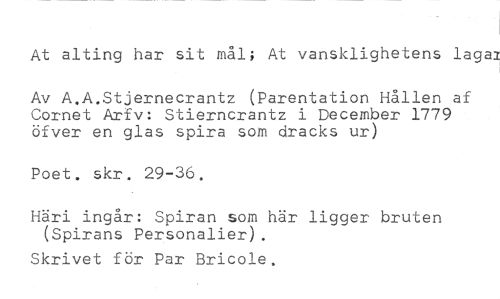 At alting har sit mål; At vansklighetens lagat, //// Av A.A.Stjernecrantz (Parentation Hållen af Cornet Arfv: Stierncrantz i December 1779 öfver en glas spira som dracks ur) //// Poet. skr. 29-36. //// Häri ingår: Spiran som här ligger bruten (Spirans Personalier). //// Skrivet för Par Bricole.