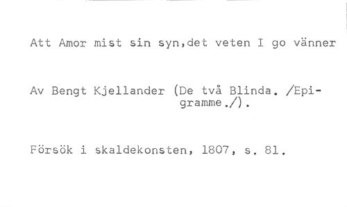 Att Amor mist sin syn,det veten I go vänner //// Av Bengt Kjellander (De två Blinda. /Epi- //// gramme./). //// Försök i skaldekonsten, 1807, s. 81.
