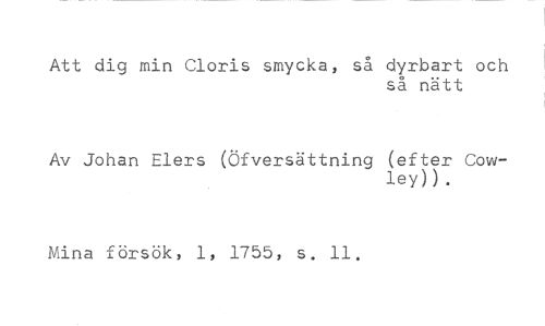 Att dig min Cloris smycka, så dyrbart och //// så nätt //// Av Johan Elers (Öfversättning (efter Cow- //// ley)). //// Mina försök, 1, 1755, s. 11.