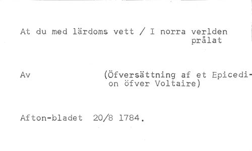 At du med lärdoms vett / 1 norra verlden //// prålat //// Av (Öfversättning af et Epicedi- //// on öfver Voltaire) //// Afton-bladet 20/8 1784.