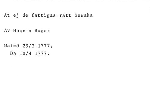 At ej de fattigas rätt bewaka //// Av Haqvin Bager //// Malmö 29/3 1777. DA 10/4 1777.