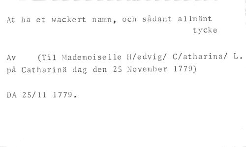 At ha et wackert namn, och sådant allmänt //// tycke //// Av (Til Mademoiselle H/edvig/ C/atharina/ L. //// på Catharinä dag den 25 November 1779) //// DA 25/11 1779.