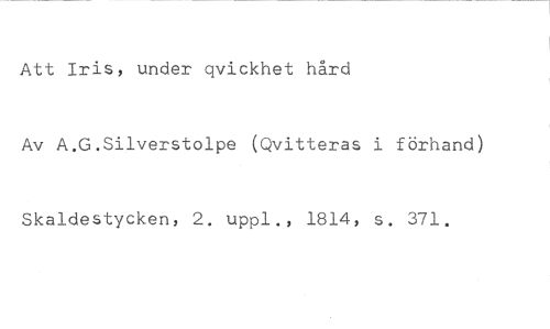 Att Iris, under qvickhet hård //// Av A.G.Silverstolpe (Qvitteras i förhand) //// Skaldestycken, 2. uppl., 1814, s. 371.