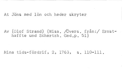 At Jöns med lön och heder skryter //// Av (Olof Strand) (Wisa. /Övers. från:/ Ernsthaffte und Schertzh. Ged.p. 51) //// Mina tids-fördrif, 2, 1763, s. 110-111.