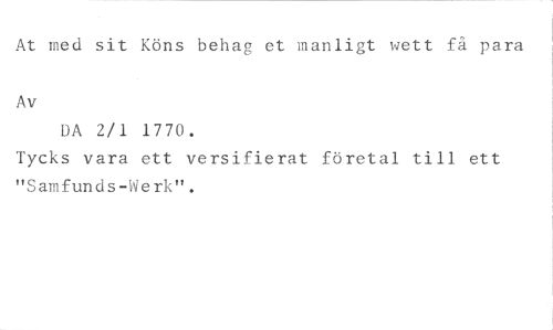 At med sit Köns behag et manligt wett få para //// Av //// DA 2/1 1770. //// Tycks vara ett versifierat företal till ett "Samfunds-Werk".
