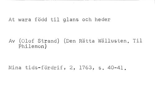 At vara född til glans och heder //// Av (Olof Strand) (Den Rätta Wällusten. Til Philemon) //// Mina tids-fördrif, 2, 1763, s. 40-41.
