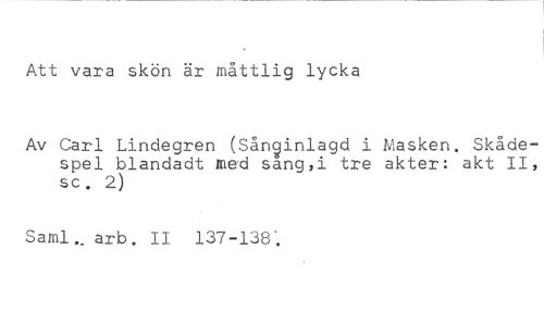 Att vara skön är måttlig lycka //// Av Carl Lindegren (Sån9inlagd i Masken. Skådespel blandadt med sang,i tre akter: akt II, sc. 2) //// Saml, arb. II 137-138