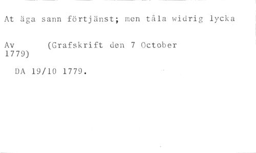 At äga sann förtjänst;.men tåla widrig lycka //// Av (Grafskrift den 7 October //// 1779) //// DA 19/10 1779.