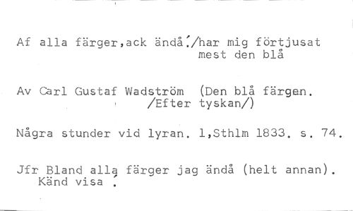 Af alla färger,ack ändå:/har mig förtjusat //// mest den blå //// Av Carl Gustaf Wadström (Den blå färgen. //// /Efter tyskan/) //// Några stunder vid lyran. 1,Sthlm 1833. s. 74. //// Jfr Bland alla färger jag ändå (helt annan). Känd visa