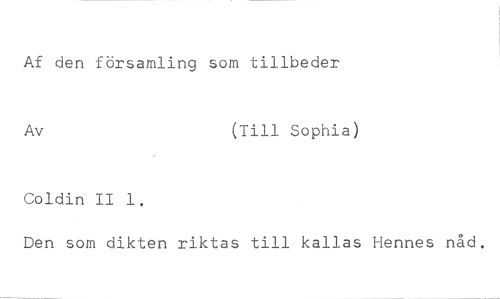 Af den församling som tillbeder //// Av (Till Sophia) //// Coldin II 1. //// Den som dikten riktas till kallas Hennes nåd.