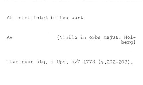 Af intet intet blifva bort //// Av (Nihilo in orbe majus. Hol- //// berg) //// Tidningar utg. i Ups. 5/7 1773 (s.202-203).