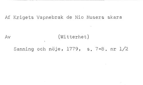Af Krigets Vapnebrak de Nio Musers skara //// Av (Witterhet) //// Sanning och nöje, 1779, s. 7-8. nr 1/2