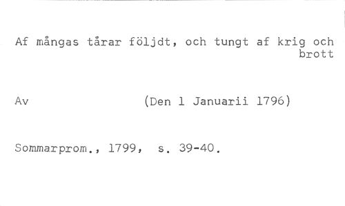 Af mångas tårar följdt, och tungt af krig och //// brott //// Av (Den 1 Januarii 1796) //// Sommarprom., 1799, s. 39-40.