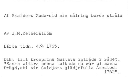 Af Skalders Guda-eld min målning borde stråla //// Av J.N.Zetherström Lärda tidn. 4/4 1765. //// Dikt till kronprins Gustavs inträde i rådet. "Samma wittra penna tolkade då wår allmänna frögd,uti sin Svidjots glädjefulla Arestod, //// 1762".