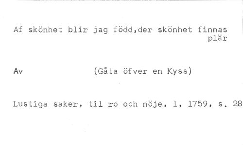 Af skönhet blir jag född,der skönhet finnas //// plär //// Av (Gåta öfver en Kyss) //// Lustiga saker, til ro och nöje, 1, 1759, s. 28