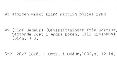Af stormen wräkt kring nattlig böljas rymd //// Av (Elof Jedeur) (Öfversättningar från Hortius.. Sextonde Odet i Andra Boken. Till Grosphus) (Sign.:) J. //// StP 20/7 1826. - Omtr. i Odeum,1832,s. 12-14.