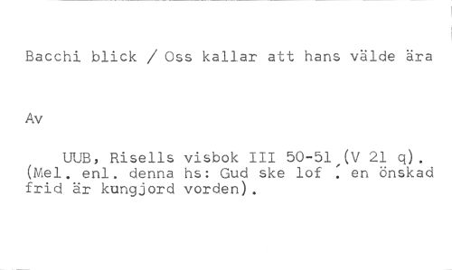 Bacchi blick / Oss kallar att hans välde ära //// Av //// UUB, Risells visbok III 50-51,(V 21 q). (Mel. enl. denna hs: Gud ske lof : en önskad frid är kungjord vorden).