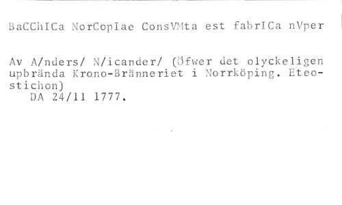 BaCChICa NorCoplae ConsVMta est fabrlCa nVper //// Av A/nders/ N/icander/ (Öfwer det olyckeligen upbrända Krono-Bränneriet i Norrköping. Eteostichon) //// DA 24/11 1777.