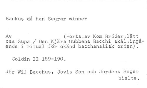 Backus då han Segrar winner //// Av (Forts.av Kom Bröder,lätt //// oss Supa / Den Kjära Gubbens Bacchi skål,ingående i ritual för okänd bacchanalisk orden). //// Coldin II 189-190. //// Jfr Wij Bacchus, Jovis Son och Jordens Seger //// hielte.