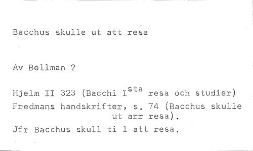 Bacchus skulle ut att resa //// Av Bellman ? //// Hjelm II 323 (Bacchi Ista resa och studier) //// Fredmans handskrifter, s. 74 (Bacchus skulle //// ut arr resa). //// Jfr Bacchus skull ti 1 att resa.