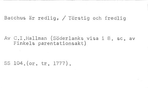 Bacchus är redlig, / Törstig och fredlig //// Av C.I.Hallman (Södertanks visa i 8. sc. av Finkels parentationsakt) //// SS 104.(or. tr. 1777).