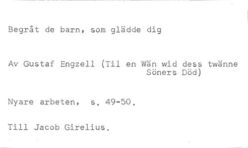 Begråt de barn, som glädde dig //// Av Gustaf Engzell ("Fil en Wän wid dess twänne //// Söners Död) //// Nyare arbeten, s. 49-50. //// Till Jacob Girelius.