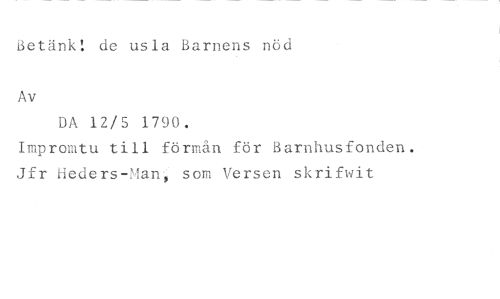 Betänk: de usla Barnens nöd //// Av //// DA 12/5 1790. //// Impromtu till förmån för Barnhusfonden. Jfr Heders-Man som Versen skrifwit