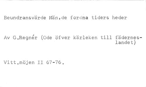 Beundransvärde flän,de fordna tiders heder //// Av G.Regner (Ode öfver kärleken till fädernes- //// landet) //// Vitt.nöjen II 67-76.
