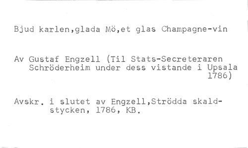 Bjud karlen,glada Mö,et glas Champagne-vin //// Av Gustaf Engzell (Til Stats-Secreteraren Schröderheim under dess vistande i Upsala //// 1786) //// Avskr. i slutet av Engzell,Strödda skald-stycken, 1786, KB.