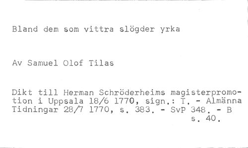 Bland dem som vittra slögder yrka //// Av Samuel Olof Tilas //// Dikt till Herman Schröderheims magisterpromotion i Uppsala 18/6 1770, sign.: T. - Almänna Tidningar 28/7 1770, s. 383. - SvP 348. - B //// s. 40.