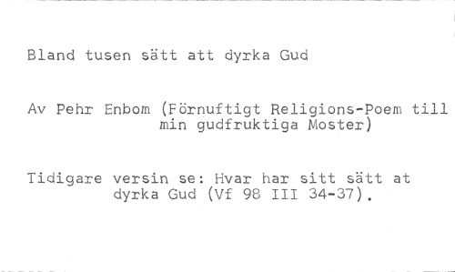 Bland tusen sätt att dyrka Gud //// Av Pehr Enbom (Förnuftigt Religions-Poem till min gudfruktiga Moster) //// Tidigare versin se: Hvar har sitt sätt at //// dyrka Gud (Vf 98 III 34-37).