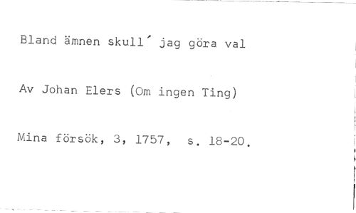 Bland ämnen skull' jag göra val //// Av Johan Elers (Om ingen Ting) //// Mina försök, 3, 1757, s. 18-20.