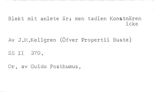Blekt mit anlete är; men tadlen Konstnären //// icke //// Av J.H.Kellgren (Öfver Propertii Buste) SS II 370. //// Or. av Guido Posthumus.