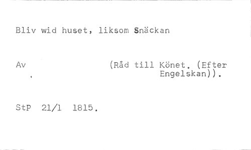 Bliv wid huset, liksom Snäckan //// Av (Råd till Könet. (Efter //// Engelskan)). //// StP 21/1 1815.