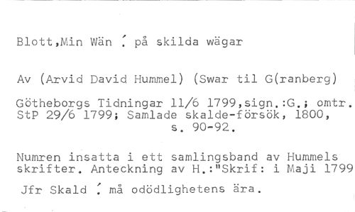 Blott,Min Wän : på skilda vägar //// Av (Arvid David Hummel) (Swar til Granberg) //// Götheborgs Tidningar 11/6 1799,sign.:G.; omtr. StP 29/6 1799; Samlade skalde-försök, 1800, //// s. 90-92. //// Numren insatta i ett samlingsband av Hummels skrifter. Anteckning av H.:"Skrif: i Maji 1799 //// Jfr Skald : må odödlighetens ära.