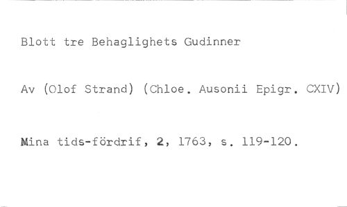Blott tre Behaglighets Gudinner //// Av (Olof Strand) (Chloe. Ausonii Epigr. CXIV) //// Mina tids-fördrif, 2, 1763, s. 119-120.