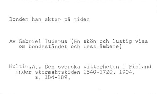 Bonden han aktar på tiden //// Av Gabriel Tuderus (En skön och lustig visa om bondeståndet och dess ämbete) //// Hultin,A., Den svenska vitterheten i Finland under stormaktstiden 1640-1720, 1904. s. 184-189.
