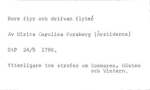 Bore flyr och drifvan flyter'. //// Av Ulrica Carolina Forsberg (Årstiderna) StP 24/5 1788. //// Ytterligare tre strofer om Sommaren, Hösten //// och Vintern.